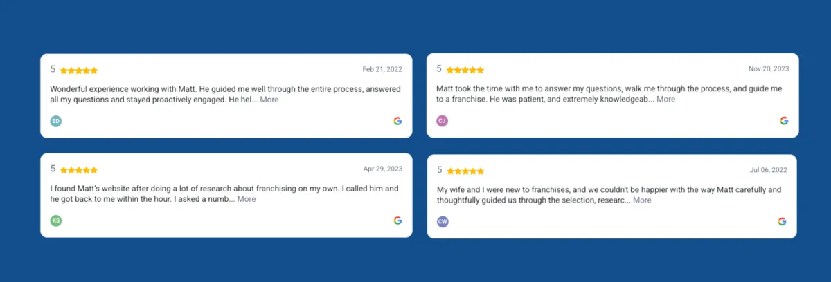 Whether franchising is the right fit for you or not, I provide exclusive, behind-the-scenes franchise insights to help you make an informed decision. I’m here to save you time, frustration, and money by giving you the real story on franchise opportunities that align with your goals. If the right fit isn’t available, I’ll tell you that too—because my priority is finding what works best for you.